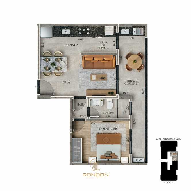 Os apartamentos contam com 1 dormitório, banheiro, sala de estar integrada à sala de jantar, cozinha, área de serviço e um terraço gourmet que valoriza cada momento dentro de casa. Além disso, cada unidade possui vaga de garagem, trazendo mais comodidade ao seu dia a dia.